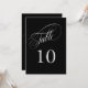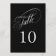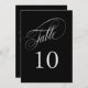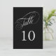 An elegant table number card in black with silver text featuring beautiful calligraphy script text. This design in the 5-inch by 7-inch size is a wonderful choice for weddings, banquets, dinners, luncheons, and parties that use black and silver in the color scheme. To create table numbers for each table, personalize a single card for Table 1 and add to cart, then personalize a table card for Table 2 and add to cart, and so on until you have a card for each table.