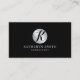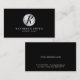 featuring black script monogram in silver circle element with business information in silver professional font style on black background.