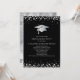 This modern design features a graduation hat and confetti in silver on a background of black with white text.