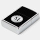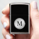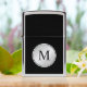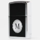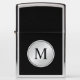 A tasteful professional look featuring a silver round disc frame with monogram over a black background. Simply edit the monogram shown with your desired initial. This lighter makes a wonderful custom gift.