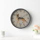 Destei's original cartoon illustration of a black and tan color German Shepherd breed dog. The background color is beige with a decorative texture. The texture can be removed and the background color can be changed to any other color, if so wished. The hours are marked with numbers. The hours and minutes are shown with a dotted clock face. There is also a personalizable text area for a name or other custom text.