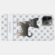Destei's original cartoon illustration of a black and tan smooth coat Chihuahua breed dog. There is also a personalizable text area for a name. The background has a pattern of gray dog paw prints.