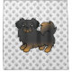 Destei's original cartoon illustration of a cute black and tan coat color Tibetan Spaniel breed dog. The background has a pattern of gray dog paw prints.