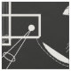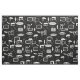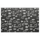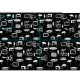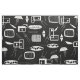 Mid-century modern fabric, black and white abstract pattern with quirky shapes and lines. White pattern on a black background.