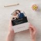 Elevate your wedding with our Modern Black and White Wedding Invitation. It features a modern font, shiny wedding rings, your own favorite couple's photo, and a tear-off RSVP card, it epitomizes style and convenience.