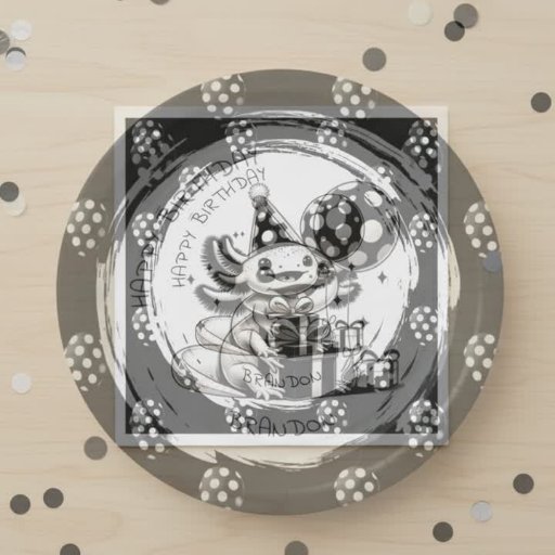 A cute axolotl and birthday balloons themed personalized birthday party paper plates with black and white balloons with polka dots and an axolotl with birthday gifts and balloons.
