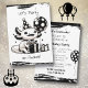 Black and white Axolotl themed kid's birthday party invitations. A cute axolotl in a birthday hat with balloons. Lots of black and white polka dots. Gender-neural! Cute for boys or girls!