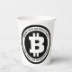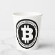 Celebrate in style with custom party supplies. These paper cups are ready to be customized with your own messages with one message at the top and one at the bottom. In the center is a Bitcoin symbol in black against a white background. The design appears on both sides of the cup.