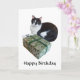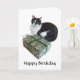 A black and white cat holds an elegantly wrapped gift on this fun birthday card.