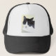 A watercolor painting of a black and white tuxedo kitty adorns this hat!