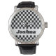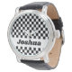 Cool, custom, unique, one-of-a-kind watch has a black and white checkered flag design on the front. Personalize the front by changing the name to whatever you like. This would make a great gift for the race car enthusiast in your life. Please see our other custom checker flag items.