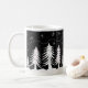 An elegant design in black and white featuring Christmas trees and stars and snowflakes.