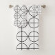 Black and White Stripes Circle Geometric Pattern Bath Towel Set designed by Nisha Prabhu CuteHomeGifts. Mid century modern design featuring black and white circles with black color horizontal vertical stripes on white background.