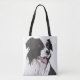This useful tote bag unusual design features my drawing of a black and white Border Collie with blue eyes. The drawing is based on my own pet Gypsy, who was a loyal friend for many years. She blue eyes, but I have also seen Collies with brown eyes, and even one of each!
