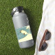 This vinyl sticker has a black and white crane flying past a cresting ocean wave on a blue background.