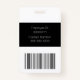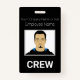 This custom photo identification badge features a sample photograph in the center. The title "CREW" is printed below it in bold white font over a black background to signify the individual as a crew member for your event. You can include your company name or additional text above the image, as well as an employee name. The back of the badge features additional employee or company information printed over a black background, with a sample barcode placed at the bottom. You can replace the scan code with your own, or another image, such as a custom logo.
