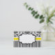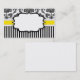 Elegantly presented business card having a black and white damask background with a yellow band. A label in the center is available for text.