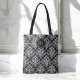 A chic tote bag with function and style, this design features a lovely white damask pattern over a black background. Personalize with your desired monogram by replacing the sample initials shown in the easy-to-use text template. It makes a wonderful gift for any lady on your gift list or a special treat for yourself. There are so many practical uses for this tote, from shopping, trips to school, visits to the library, or carrying items to the office, you can find hundreds of uses for this handy tote bag.