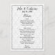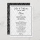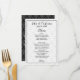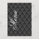 Modern wedding table menu done in a white on white damask pattern, on the front, and a black on black damask pattern, on the back. A thin black border decorates the front of the menu with custom black text ready to personalize. Lovely addition to your wedding reception.