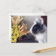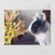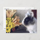 Portrait of black and white dwarf rabbit (Mammal) near yellow daisies