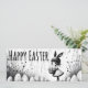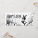 A stylish black and white illustration featuring a cute girl with bunny ears holding a basket of Easter eggs. The minimalist and slightly whimsical scene blends artistic charm with a modern Easter aesthetic.