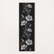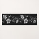 A black and white floral design featuring a vertical arrangement of flowers and foliage against a black background. The flowers are detailed with intricate line work, giving them a delicate and elegant appearance. The leaves and stems are also rendered with fine lines, creating a sense of depth and texture. The overall style is reminiscent of vintage botanical illustrations, with a focus on detail and precision. The monochromatic color scheme adds to the timeless quality of the design.