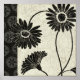 © Daphne Brissonnet / Wild Apple. Three flowers in full bloom, in black and white. The image has a floral patterned background in an off white shade and black on the left side.