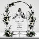 Black and white flowers wedding welcome sign. This beautiful wedding welcome board sign will undoubtedly enhance the memorability of your celebration. Featuring a striking arrangement of black and white flowers at the top, it is designed to captivate your guests. The reverse side showcases a white floral garland elegantly contrasted against a black backdrop.
