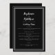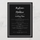 A formal and elegant wedding menu featuring a double white frame on a rich black background. The design showcases the couple’s first names in large romantic script at the top, followed by the event date and a smaller “Wedding Menu” heading. Dinner selections are displayed in clean white typography for a striking, modern presentation. The back of the card is finished in solid black for a cohesive, polished look — perfect for formal receptions and rehearsal dinners.
