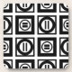 Bold geometric pattern features four black squares with white space between them. The two diagonally opposed thick squares each contain a thin black circle with a thick equal sign inside. In contrast, the two thin squares each contain a thick black circle that touches the square’s edges with a thin vertical equal sign inside.