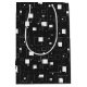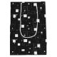 This image features a modern, abstract geometric pattern in black and white. It consists of various-sized squares and rectangles arranged randomly across a black background. Some shapes are solid white, while others are outlined, creating a layered effect. Small dots and pixel-like elements are scattered throughout, adding depth and texture. The overall design is minimalistic and conveys a digital or futuristic aesthetic.