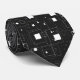 This image features a modern, abstract geometric pattern in black and white. It consists of various-sized squares and rectangles arranged randomly across a black background. Some shapes are solid white, while others are outlined, creating a layered effect. Small dots and pixel-like elements are scattered throughout, adding depth and texture. The overall design is minimalistic and conveys a digital or futuristic aesthetic.