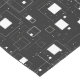 This image features a modern, abstract geometric pattern in black and white. It consists of various-sized squares and rectangles arranged randomly across a black background. Some shapes are solid white, while others are outlined, creating a layered effect. Small dots and pixel-like elements are scattered throughout, adding depth and texture. The overall design is minimalistic and conveys a digital or futuristic aesthetic.