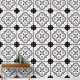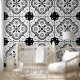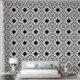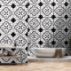 A stylish modern black and white geometric abstract shapes and quatrefoil shaped peel and stick wallpaper wall treatment, to modernize your bath, kitchen, or any room. Perfect when you live in a rental apartment that needs your personal style and touches of design to make things pop. Peel and stick wallpaper is one of the best DIY hacks for apartment dwellers to give them more control over their home decor style! Go wild with patterns and colors. Comes in smooth and textured. Get the textured for bumpy textured walls, and smooth or textured for smooth walls.