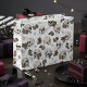 Hand-drawn in black ink, this gift bag features a beautiful pattern of skulls, roses and spiderwebs in cream and blush tones, all against a white background.