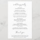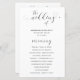 Black and white typography wedding program featuring the words, "the wedding of" with swashes, a heart at the end and dotting the "i". Below are your names, city, state and date. The front has your order of ceremony and the back has your wedding party and thank you message. These cheap wedding programs are printed on sheets of paper for a budget friendly option.
