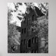 Close up view of dark gray color historical, traditional and typical building showing Dutch architectural style in Amsterdam. It is a sunny summer day. Black and white photography