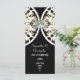 Traditional classic black and white lace faux paper cut style old traditional vintage damask pattern and a pretty silver bow. A sophisticated pretty and modern elegant luxury lacy formal marriage church wedding program announcement which can be easily personalized with the bride and grooms names and other bridal guests text to the templates to create your own chic luxurious professional marriage program for your special occasions events and celebrations. Easily customize the background color, from a huge range of custom colors to create your own totally different look to this unique contemporary faux paper cut vintage themed luxury invite. Visit the PERSONALIZED_ WEDDINGS STORE for matching coordinated wedding suite sets.