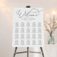 Elegant and modern 20 wedding table plan Seating Chart Foam Board Sign features the word "welcome" in a beautiful elegant calligraphy script with a stylish white background. Customize your name, wedding date and seating chart for 20 tables.