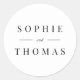 This wedding sticker features the names of the wedding couple in black against a white color.