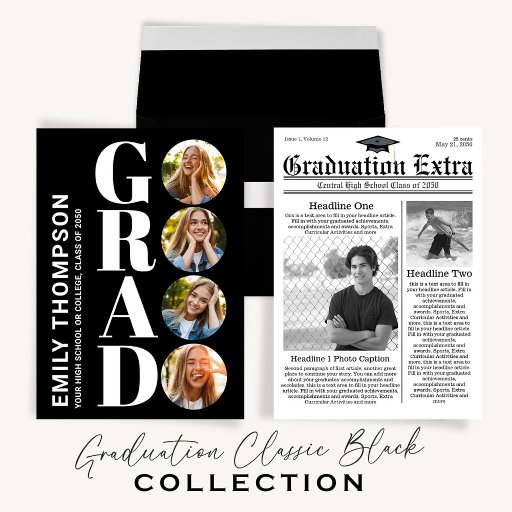 Celebrate your milestone with these photo graduation invitations, featuring a clean and chic design perfect for any high school graduate or college grad. The simple yet stylish black-and-white layout, combined with bold typography and a modern template, creates a sleek and sophisticated look. Announce your class of [year] achievement in a trendy senior graduation style. Personalize with your favorite photo and event details for an unforgettable invitation!