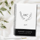 Black and White Monogram Wreath 2025 Planner... The front of our classic black and white planner displays a business logo of an elegant botanical wreath bordering your two monogram initials in black ink... all on a white background. Your name and title (or company name) appear in white ink on a black rectangle bordering the bottom of the planner, giving an authoritative structure to balance the delicate leafy wreath. All text can be easily revised on the personalization template.