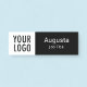 Personalize our professional name tag with your company logo, employee name, professional job title, or other custom text. It's available with a safety pin back or with a magnetic back fastener (do not use with pacemakers). This is a 3 inch x 1 inch black and white name tag with a modern minimalist design. All colors are customizable. Available in other shapes. The rectangle name tags have options for rounded corners or regular corners. No minimum order quantity and no setup fee.