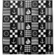 Black and white patchwork pattern shower curtain featuring geometric checks and stripes as well as seahorses, sailing boats, anchors, and ships’ wheels.