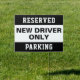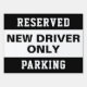 A silly and fun sign designating reserved parking only for new drivers, a perfect way to troll the new driver or sixteen year old teen in your life.