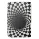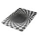 A tunnel-like optical illusion is created using a black and white checkered pattern, giving a dizzying sense of depth