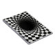 A tunnel-like optical illusion is created using a black and white checkered pattern, giving a dizzying sense of depth