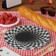 A tunnel-like optical illusion is created using a black and white checkered pattern, giving a dizzying sense of depth