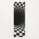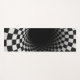 A tunnel-like optical illusion is created using a black and white checkered pattern, giving a dizzying sense of depth