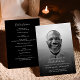 Black and white memorial order of service program with photo is a timeless and elegant tribute designed to celebrate the life and memory of a loved one. The front cover features a full-page photo in classic black and white, with the phrase “In Loving Memory” above customizable text for the name, dates, and a short tribute message, creating a refined and dignified design. Below the main details, additional lines can be included to recognize family roles or personal words of remembrance, making the program deeply personal and unique. The reverse side presents the order of service in clean white text on a solid black background, ensuring readability while maintaining a sophisticated look. This layout provides space for hymns, readings, music selections, and personal tributes, offering a structured guide for the ceremony while serving as a keepsake for family and friends. Ideal for funerals, memorial services, or celebrations of life, this personalized program blends simplicity and grace with meaningful customization. Its monochrome design ensures a polished, respectful aesthetic suitable for honoring loved ones of any age. Whether distributed at a service, mailed to relatives, or kept as a family remembrance, this custom photo funeral program offers a lasting way to celebrate a life well lived, preserve cherished memories, and bring comfort through a beautifully designed keepsake.